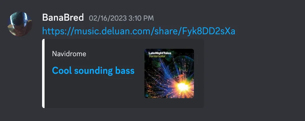 Meta-tags are added to the HTML to provide some information about the shared music on chat platforms. Example of a link shared in Discord: